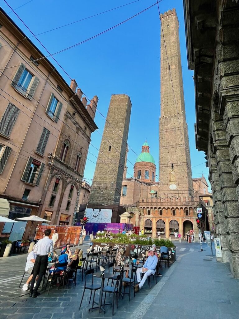V meste sa nám páčili arkády, ktorých je tam niekoľko kilometrov a chránia ľudí pred slnkom aj dažďom. Námestie je pekné, dominujú mu 2 šikmé veže, jedna vychýlená o 2, druhá až o 3 metre. Veľa domov je z červených tehál. Aj preto má Bologna prívlastok červená. Okrem toho má prívlastok vzdelaná a tučná. Vzdelaná, lebo tu je najstaršia univerzita na svete a tučná, lebo má dobrú gastronómiu. Ochutnala som cestoviny s ragú alla bolognese (naša „boloňská omáčka“) a naozaj boli skvelé. Presúvame sa do Modeny, našli sme si kemp a dnes spíme v aute.