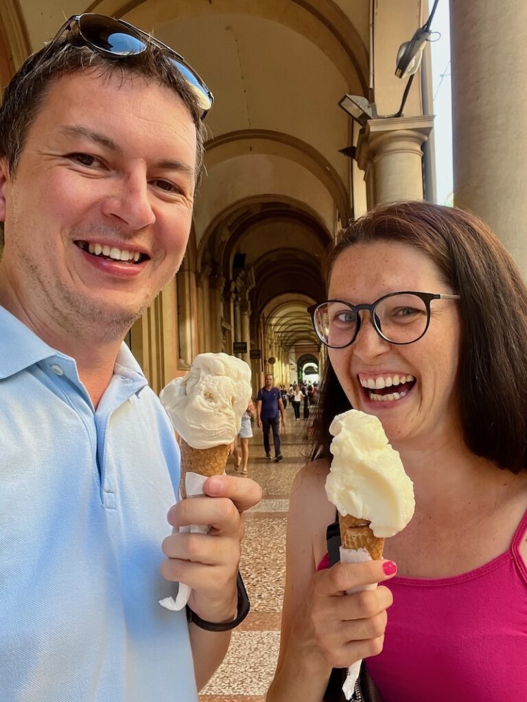Ďalej sme sa presunuli do Bologne. Tam sme si dali zmrzku, chcela som zamachrovať a použiť moje základy taliančiny, tak som Stanovi prekladala príchute. Až keď ochutnal mandarínkovú, zistil, že vôbec nechutí ako mandarínková. Mandorla mi znelo ako mandarínka, ale nakoniec to bola mandľa. Môj záchvat smiechu nájdete na jednej z fotiek. 😂🙈